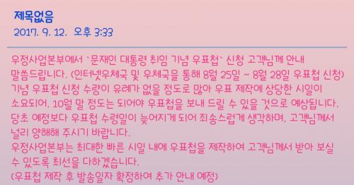 방금 같은 문자 받았습니다. 20년만에 사보는 기념우표인데 1달쯤 더 기다리는 거 문제 없습나다. ㅋ | ||