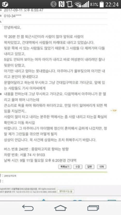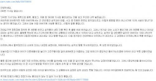 애엄마가 애찾은후에 파출소로 가서 기사 신고가능한지 문의했다는 부분에서 오지라퍼들만 욕할순 없는부분이죠 | ||