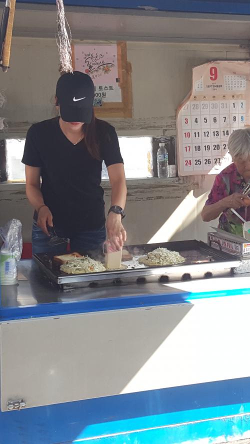 두 개 포장하는 동안 열심히 구경해보니 이제 며느리라고 인터넷에 알려져있는 분과 함께 두분이 만드시고 계셨어요 :-) 몇년전까진 할아버님 돌아가신뒤로 혼자 하신다 들었는데 역시 유명해져서 손님이 더 바글바글해지니 든든한 지원군이 출동.... 할머님은 옆에서 열심히 반죽 쉐킷쉐킷하시구 며느리분이 파전 제작하셨습니당...*.*