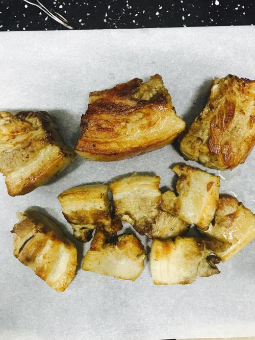 그럴땐 남은 수육을 기름 두르지말고, 팬에 네면을 바삭하게 구워줘요.