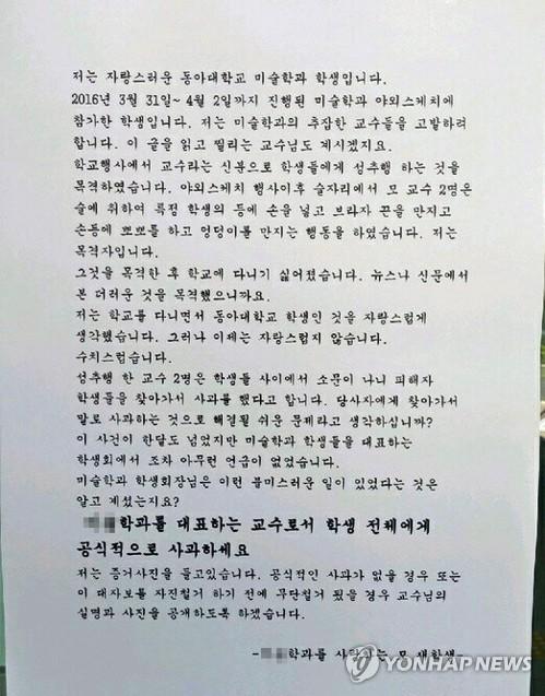 3월 말 경주 야외 스케치 수업 이후 술자리에서 교수가 제자를 성추행했다는 내용이 담긴 대자보가 학내에 붙은 뒤