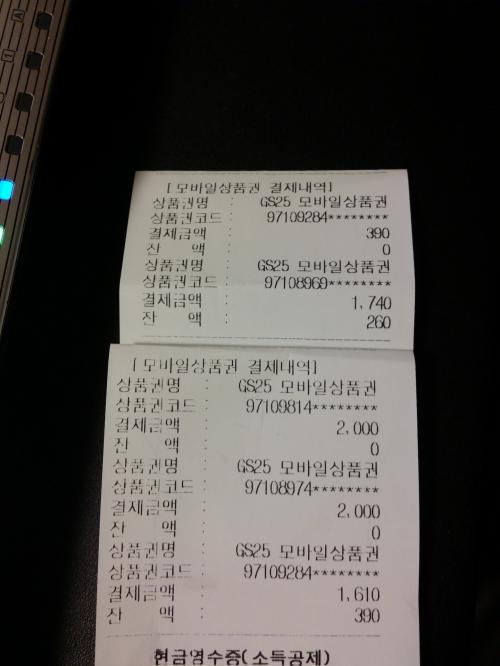한달전에 클립이벤트인가?로 받아둔 지에스상품권으로~~~ 선불폰 덕분에 총4장 8천원어치 ㅎㅎㅎ