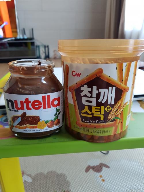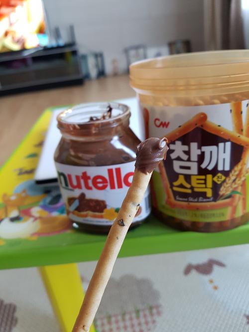 누텔라에 참깨스틱을 찍어 먹어보니 매우 맛나네요.누텔라의 달달한 초코맛과 참깨스틱의 고소함이