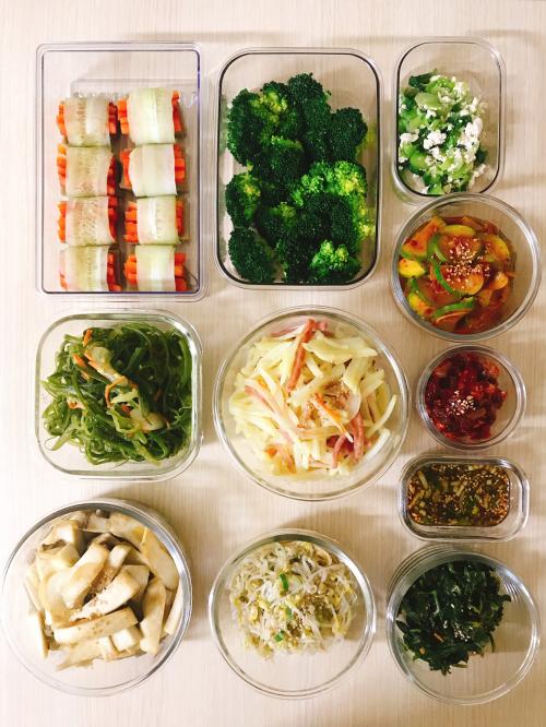 도토리묵오이말이, 데친 브로콜리, 청경채두부버무리, 매콤애호박볶음, 미역줄기볶음, 감자햄볶음, 낙지젓갈무침, 새송이버섯볶음, 숙주무침, 풍 예방에 좋다는 , 방풍나물무침까지.