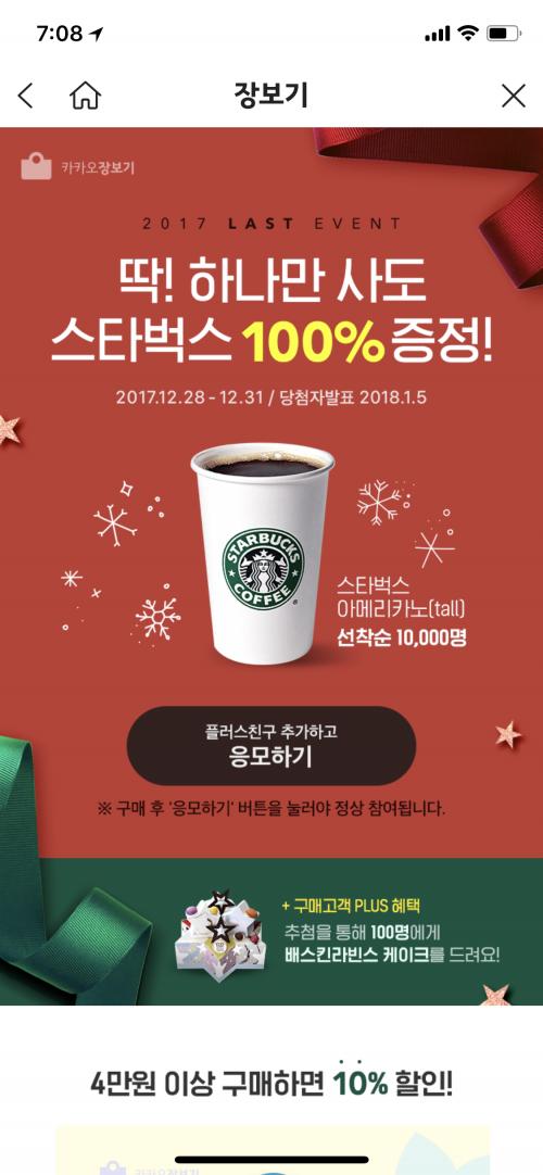 카톡-장보기로 구매하시면, 선착순으로 스벅아메 깁콘준답니다