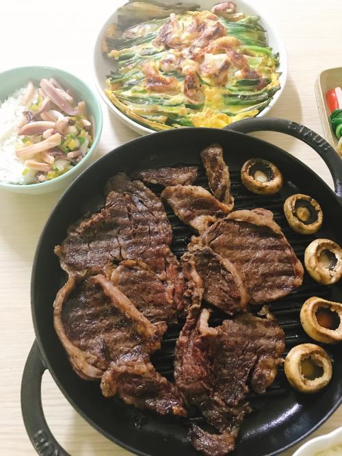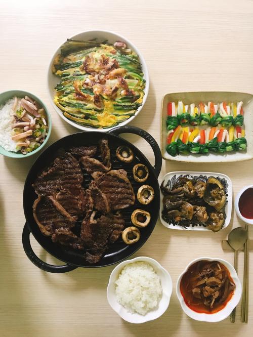 소고기는 등심 부위로 구워내고, 시장에서 한다발 두둑하게 사온 쪽파로, 오징어 넣은 강회 와, 아이가 좋아하는 파전도 만들었어요.