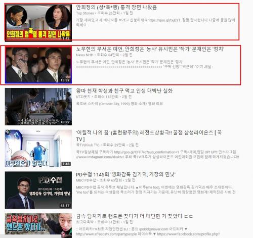 무려 5개가 안희정 관련 물타기 영상. 근래들어 이런류의 영상이 자꾸 눈에 띄기 시작..
