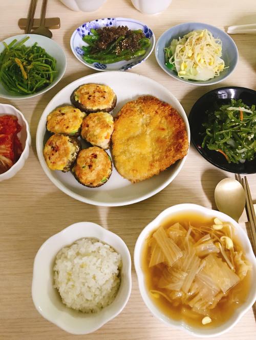 김치콩나물국 과, 새우표고버섯전 & 돈까스, 콩나물무침, 참나물무침, 미역줄기볶음, 꽈리고추소고기조림 입니다!