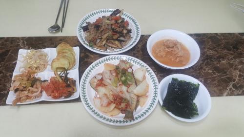 돼지고기 넣은 가지볶음하고 호박전 콩나물 무침과 콩비지찌개 돼지고기볶음 그리고 밑반찬 몇개해서 먹네요..