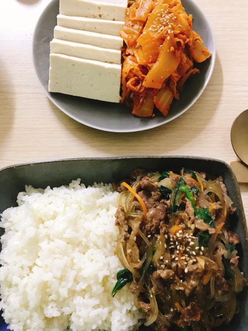 불고기잡채덮밥 과, 두부김치.