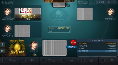 점심시간에 짬나길래 폰으로 넷마블 뉴포커를 했는데