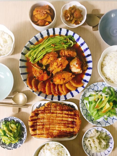 코다리 한 입, 돈가스 한 입, 샐러리 한 입, 호박과 무나물 한 입.