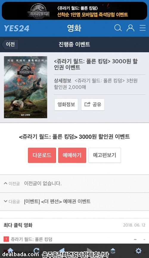 예스24 영화 쥬라기월드2 폴른킹덤 3,000원할인권 선착순
