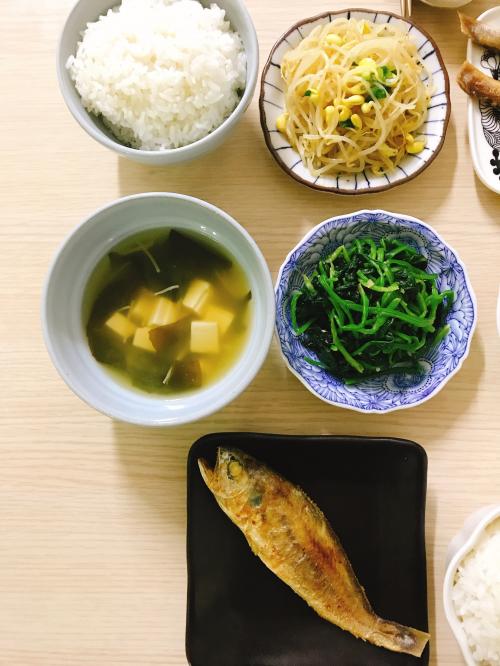 미소된장국 과, 굴비구이, 무생채, 미역초무침, 콩나물무침, 시금치나물 준비했어요.