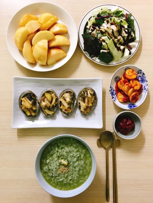 전복 여섯마리 사와, 내장으론 전복죽 끓이고, 살은 전복버터구이로 만들었어요.