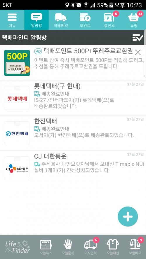 당첨된 티맵거치대의 배송조회를 할방법이 없었는데 누가 택배앱을 깔면 알수있다는 글이 보여 택배앱을 하나씩 깔았지만 조회가 안되는데 이앱에서는 조회가 되는군요. 지난 일요일에 당첨되었고 내일 배송될거니 딱 일주일이 걸립니다.