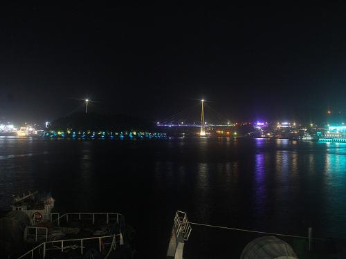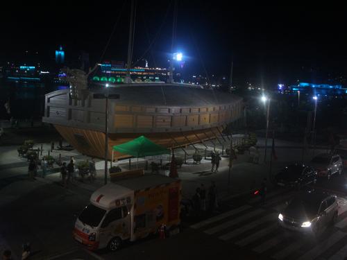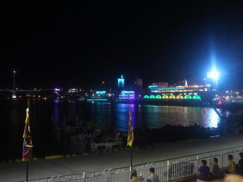 항구에서는 조명이 현란한 유람선이 떠다니고