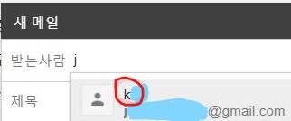 받는사람에 제 메일주소로 시작하는 j쓰면 자동으로 빨간 동그라미 친 k로 된 이름이 나타납니다.