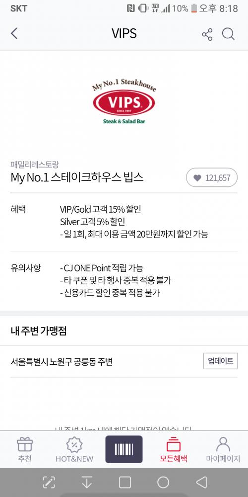 이달에 딸래미 둘이 생일이라서 일요일 저녁에 VIPS 가려고 하는데 SKT 멤버쉽 할인이 15%네요..