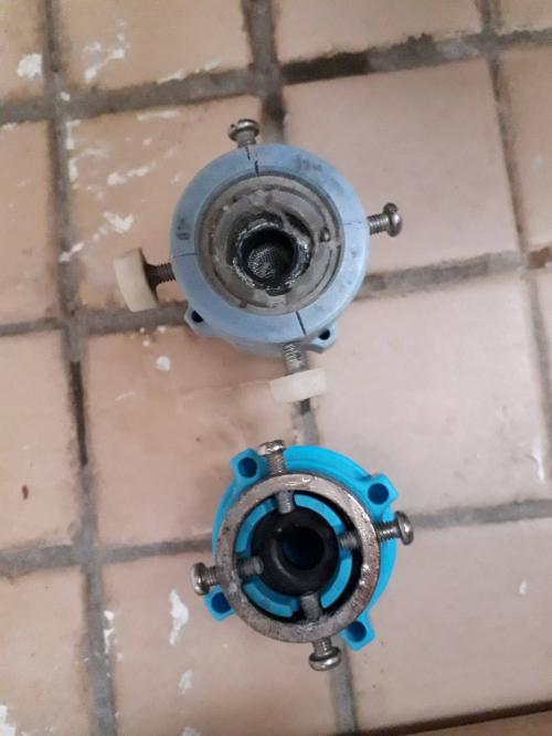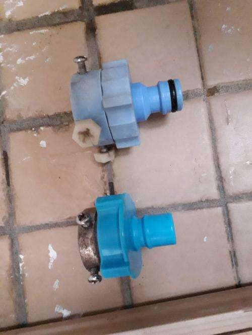 사진 아래 파랑색이 어제 물새던곳 연결되어있던거고, 윗쪽 하얀게 예전에 살던집에서 쓰던 세탁기에 연결해 쓰던겁니다.