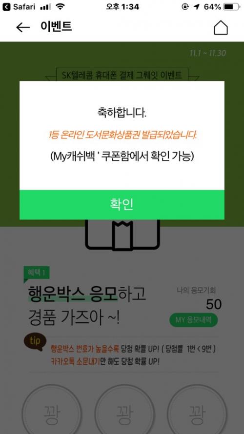 맨날... 꽝 아니면.. 오케이캐시백 50포인트가 전부였는데..