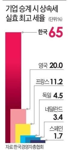 2. 기업상속 실효 세율 우리가 세계 최고? → 65%... 영국 20, 프랑스 11.2, 독일 4.5, 네덜란드 3.4, 스페인 1.7%... OECD 대부분 가업 승계에 특별 감면 혜택... 경총 자료.(한경)▼