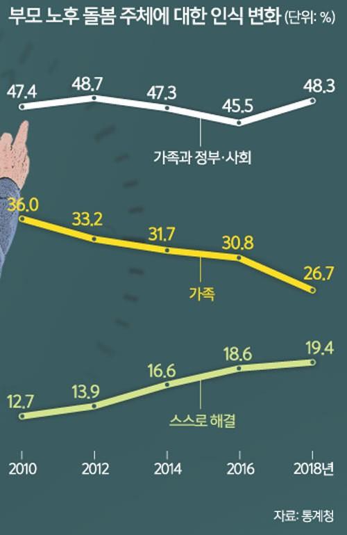 8. ‘노후 부양을 가족이 해야 한다’ → 26.7%... 10년 새 14%P 떨어져. ‘노후 스스로 해결해야 한다’ 19.4%로 7.5%P 상승. 통계청 ‘2018 사회동향’ 보고서.(세계)▼