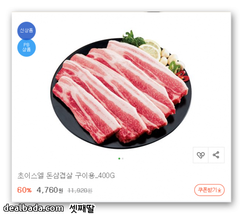 삼겹살은 100g에 1190원인데 쿠폰 적용하면 1000원이하로 떨어지네요