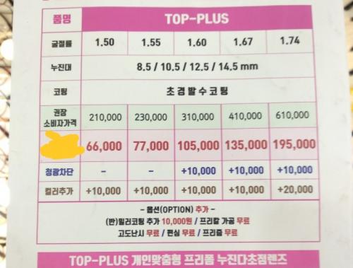 장모님이 다 초점안경을 쓰셔서 해당 렌즈 가격표도 찍어 봤네요.
