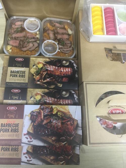 채끝등심 2개 파티박스 1개 폭립4개 치즈케이크 1개 마카롱 1개
