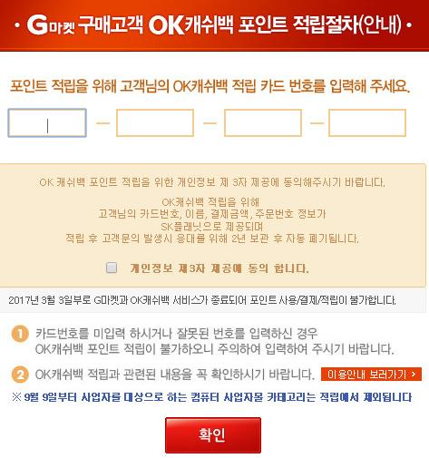 아래처럼 2017년 3월 3일부로 G마켓 OK캐쉬백 서비스가 종료되어 포인트 사용/결제/적립이 불가합니다.