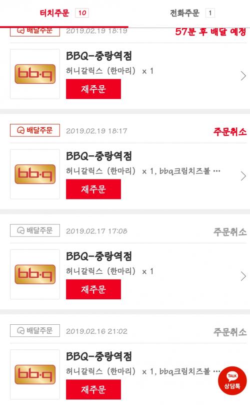 제가 양념치킨은 정말 안좋아해서 그냥 포기하고 다음날 주문했지만 다시취소. 그다음날 주문, 또다시취소. 재고가 들어왔겠지 싶은 오늘마저 주문 취소하시길래 주문표에서 치즈볼을 빼고 결제하니 바로 받아주시네요 ㅠㅠㅠㅠ치즈볼이 문제였나봅니다ㅠㅠ BHC보다 맛있다고해서 한번 먹어보고싶었는데 아쉽네용