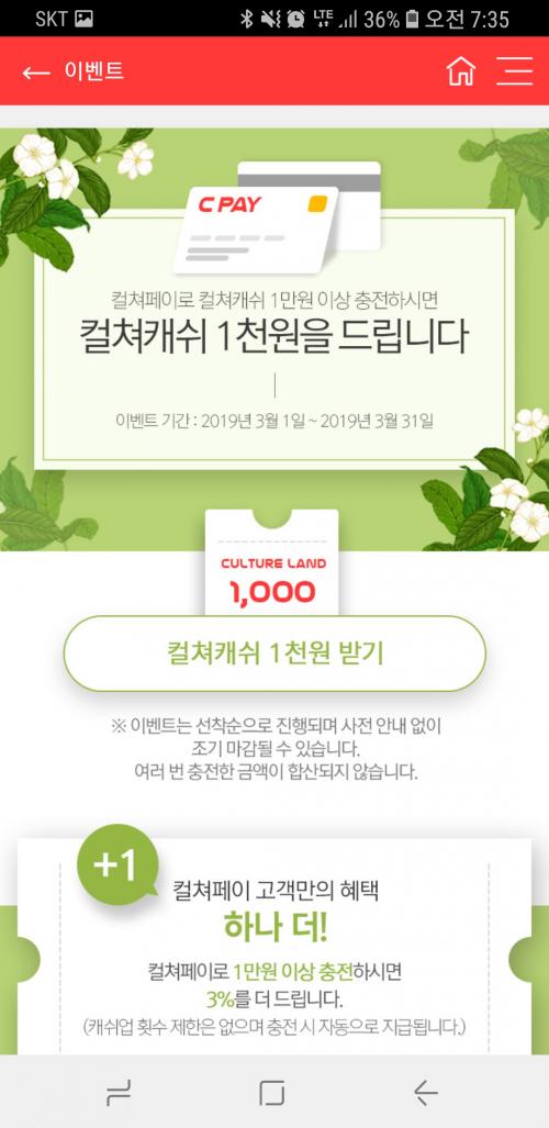하단 이벤트배버에 컬처페이 1천원 증정 누르시면