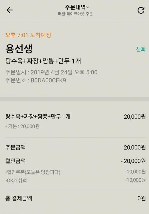 투폰 사용후 어제 오늘 이틀연속 성공하였습니다. 추가금없이 만원에 맞추는게 깔끔한데 어제 자장면만 2개먹어서