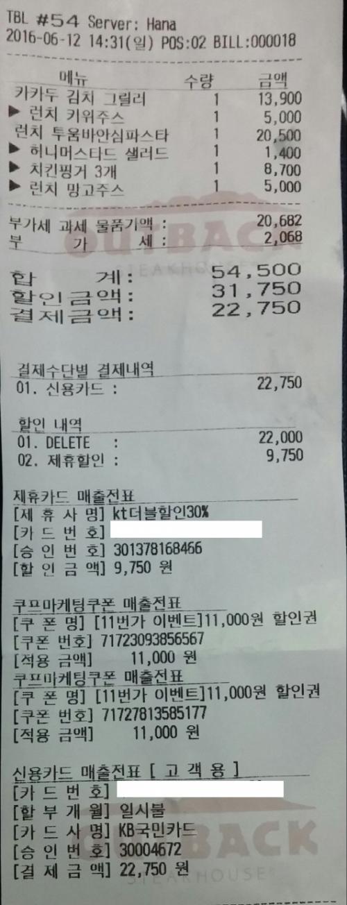 11번가 쿠폰사놓은게 있어서.. 아웃백에 다녀왔습니다.