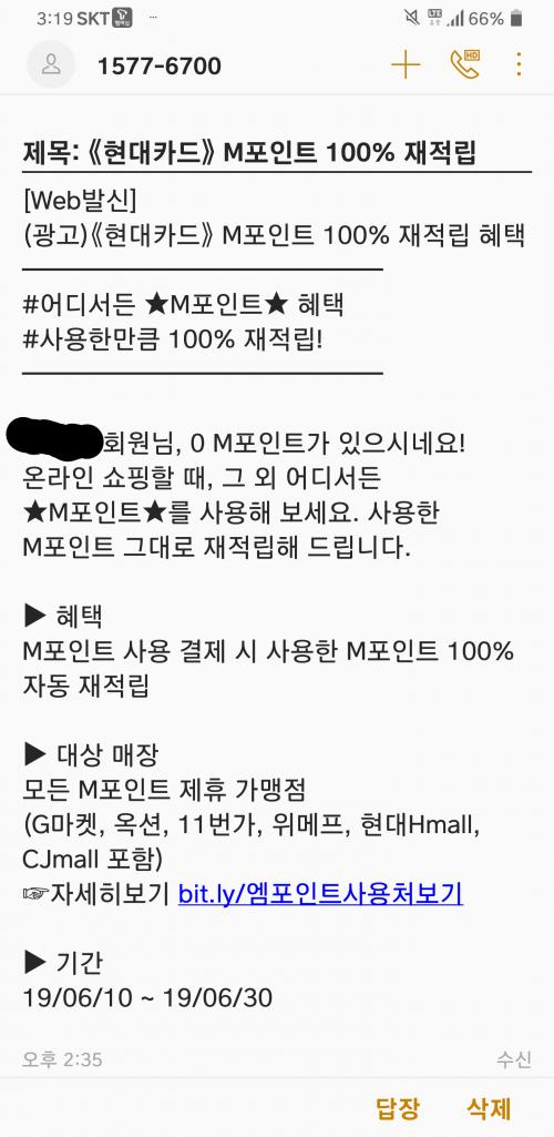 앗 저하고 같으시군요 ㅠㅠ..0m포인데 문자받았네요 | ||