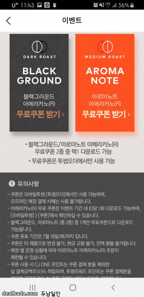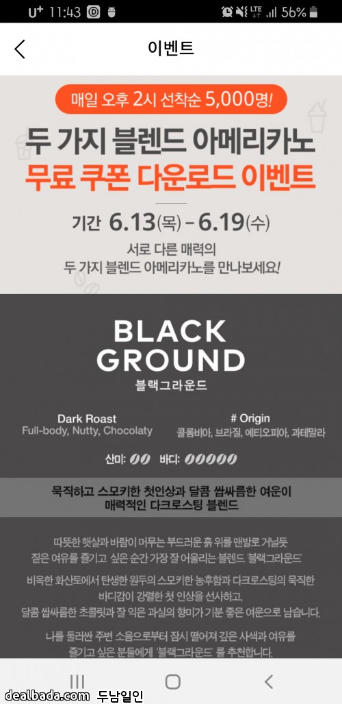 19일(수)까지 매일 오후2시 선착순 5,000명에게 아메리카노 무료쿠폰 주네요.ㅋ