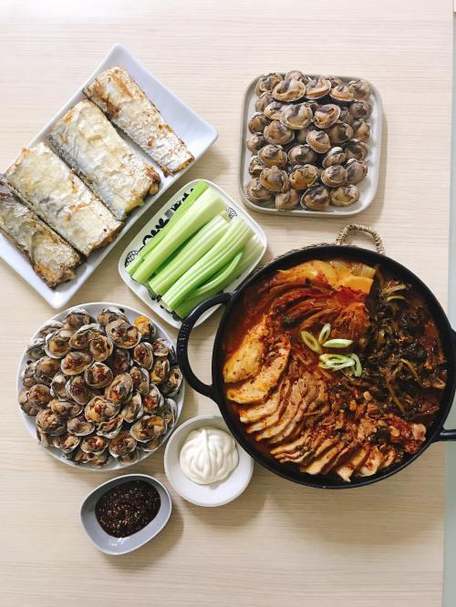 적당히 익은 묵은지 와 시래기 넣은 김치찜 과, 꼬막, 아이 반찬으로는 갈치 구웠어요.