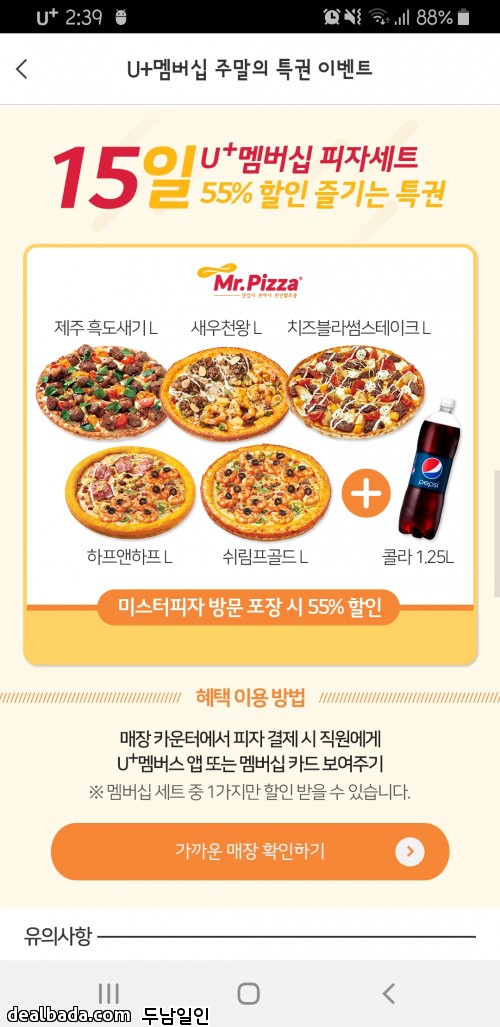 유플러스멤버십 미스터피자 55% 방문포장 할인하네요.^^