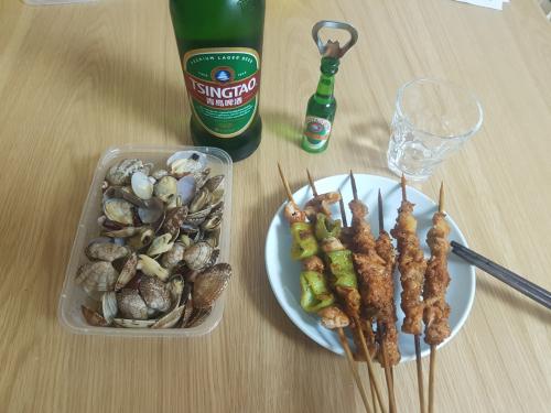 집에 칭다오는 있으니 양꼬치랑 바지락볶음을 주문했습니다.