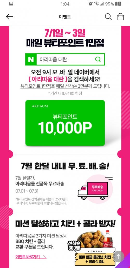그리고 7월 전품목 무료배송, 전액 포인트 결제는 제외