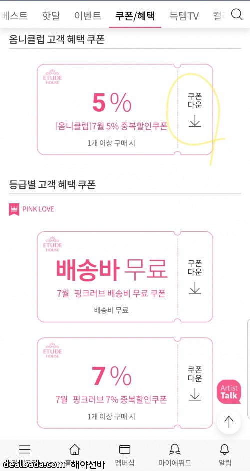 5. 에뛰드하우스 앱 - 상단 쿠폰/혜택 탭 쿠폰 다운로드 (7월 핑크러브 중복쿠폰 다운) → 7% 중복할인쿠폰