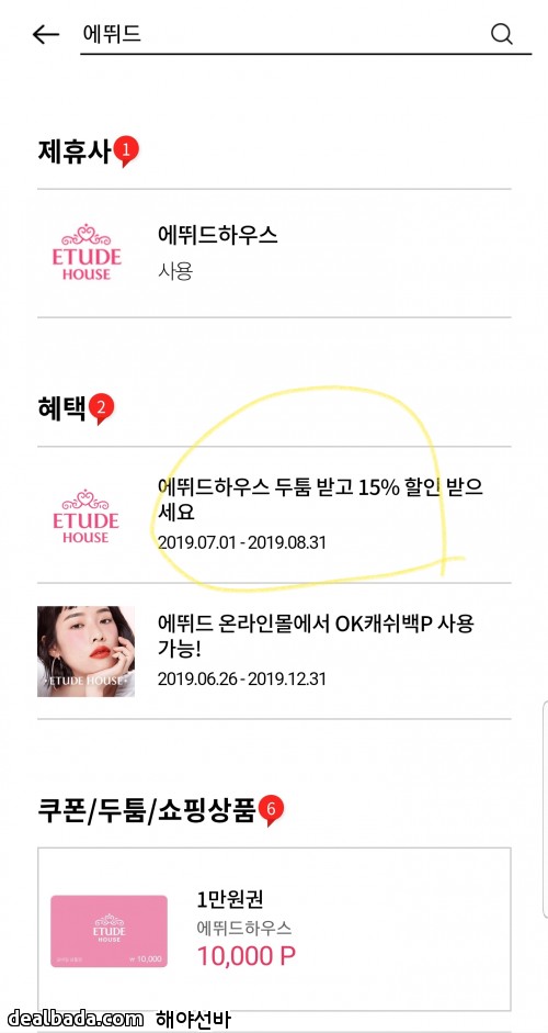 0. 오캐이캐시백앱(OCB) - 에뛰드 검색 후 에뛰드하우스 두툼포인트 발급(할인 후 금액의 15% 할인)