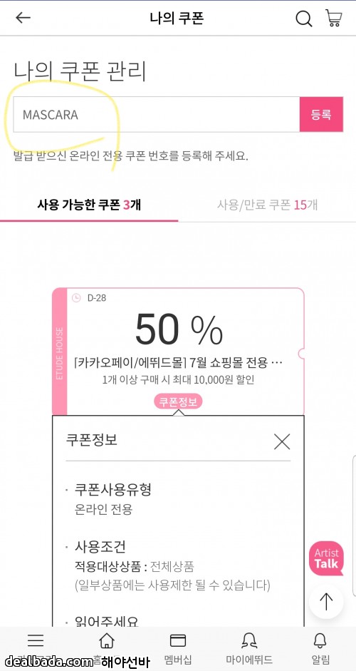 2. 에뛰드하우스 앱 - 하단 마이에뛰드 - 쿠폰 - 나의쿠폰관리 'MASCARA' 입력 → 5% 중복할인쿠폰