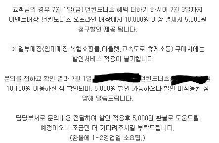 문자도 안 왔고 혹시나 해서 터치결제랑 던킨 두 개 문의했는데 하나는7월말 던킨은 7.20일에 페이백된대요 | ||