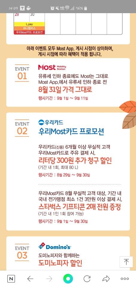 - 모스트 유류세 인하 이벤트9월에 유류세 올라가고 속 좀 쓰렸는데 모스트는 이벤트로 안 올렸더라구요 ㅋㅋ평소엔 비싸지만 이런 이벤트 할 때 너무 좋아요 ㅜㅜ오늘이 마지막이라니 아쉽지만 그래도 먼길 떠나기 전에 가득 충전시킬 수 있으니 다행입니다