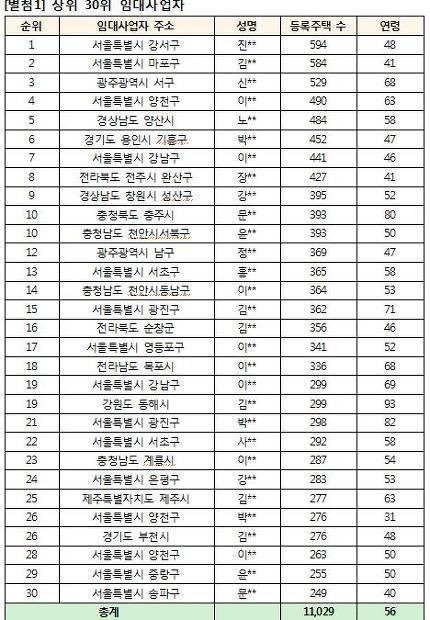 전국 임대주택 시장에서 가장 '큰 손'은 서울 강서구의 40대 주민으로, 무려 약 600채에 이르는 임대주택을 보유한 것으로 나타났다. 이 사업자를 포함해 임대주택 수 상위 30명이 보유한 주택만 1만1천여채에 이르렀다.