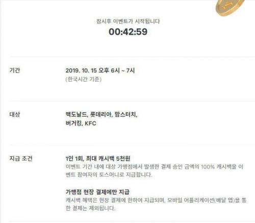 토스카드이벤트 kfc 맥도날드 버거킹 맘스터치 5000원 100% 캐시백