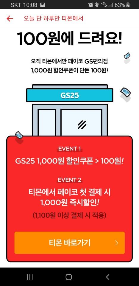 티몬에서 페이코 결재시 GS천원쿠폰 100원으로 구매 가능하며