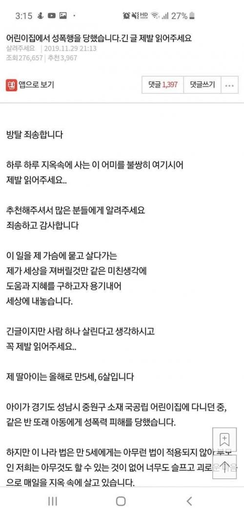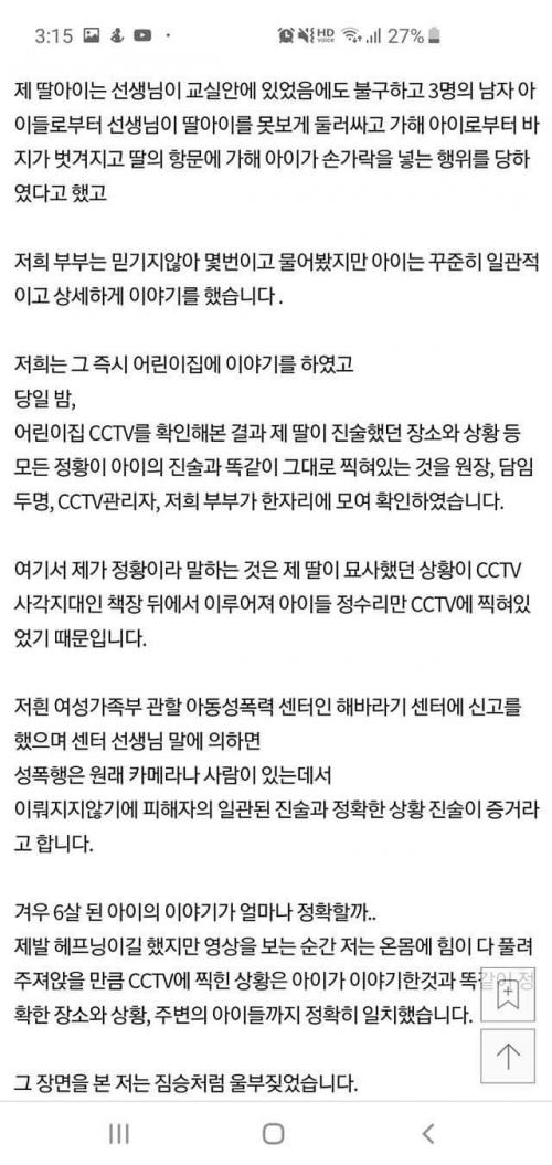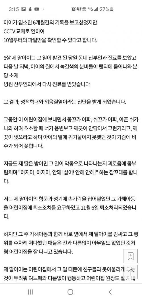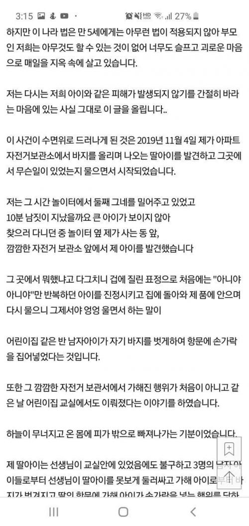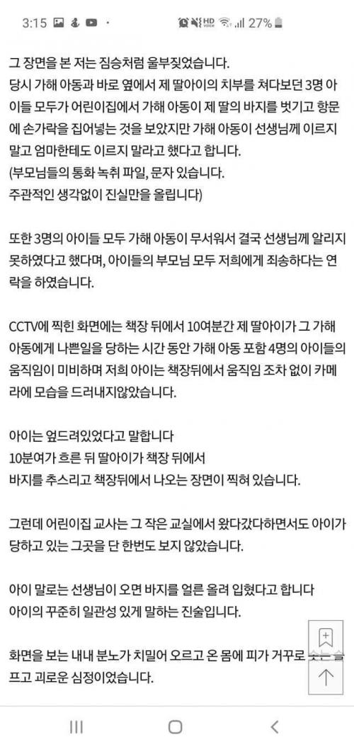 애가 어려 처벌이힘들면 결국 가해자부모와 어린이집 원장 선생이 책임져야죠~그러나저러나 애 키우기 점점 힘들어지네요 | ||
